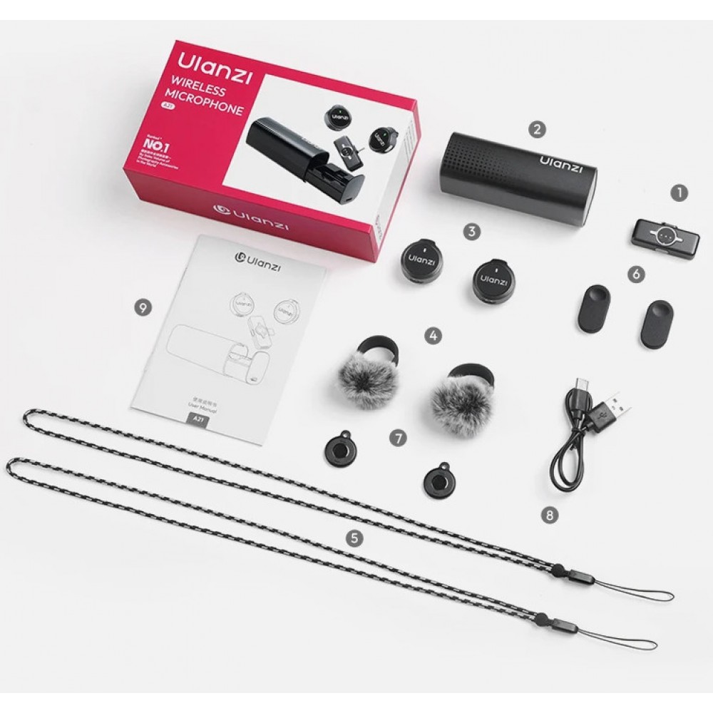 КомплектаціяУ комплект поставки Ulanzi A21 входить два чорні бездротові мікрофони, приймач з роз'ємом Lightning, кейс для зарядки та зберігання, два магніти, два вітрозахисти, два ремінці з кріпленням на шию, кабель для зарядки. |
